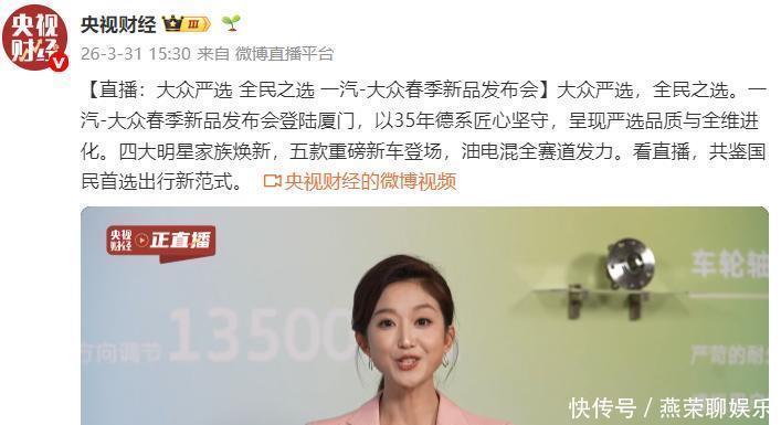 2026年3月31号上午15:30,央视财经发布消息:【直播:大众严选 全民之选 一汽-大众春季新品发布会】大众严选,全民之选。一汽-大众春季新品发布会登陆厦门,以35年德系匠心坚守,呈现严选品质与全维进化。四大明星家族焕新,五款重磅新车登场,油电混全赛道发力。看直播,共鉴国民首选出行新范式。